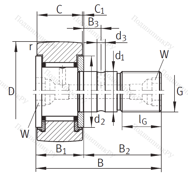 Подшипник KR 52 XPP A его конструкция практически полностью повторяет роликовые подшипниковые системы за исключением наличия втулки, которая является одновременно дорожкой качения, выполняя тем самым функцию отсутствующей внутренней шины (движение осуществляется по утолщенной головке стержня). На поверхности детали находится смазочный канал, через который осуществляется обслуживание (загрузка смазочного материала). Наружная шина утолщена и имеет сферическую (выпуклую) форму. Может комплектоваться игольчатыми роликами или другими подшипниковыми телами.