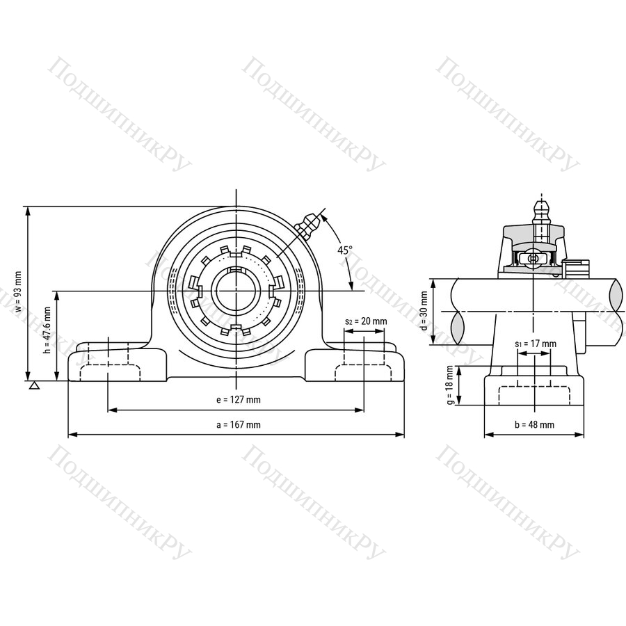 - вкладыш подшипника состоит из сплошного сферического наружного кольца, расширенного с обеих сторон внутреннего кольца с коническим отверстием, а также сепаратора; корпус Pillow Block (чугун) оснащен двумя пазами для фиксации